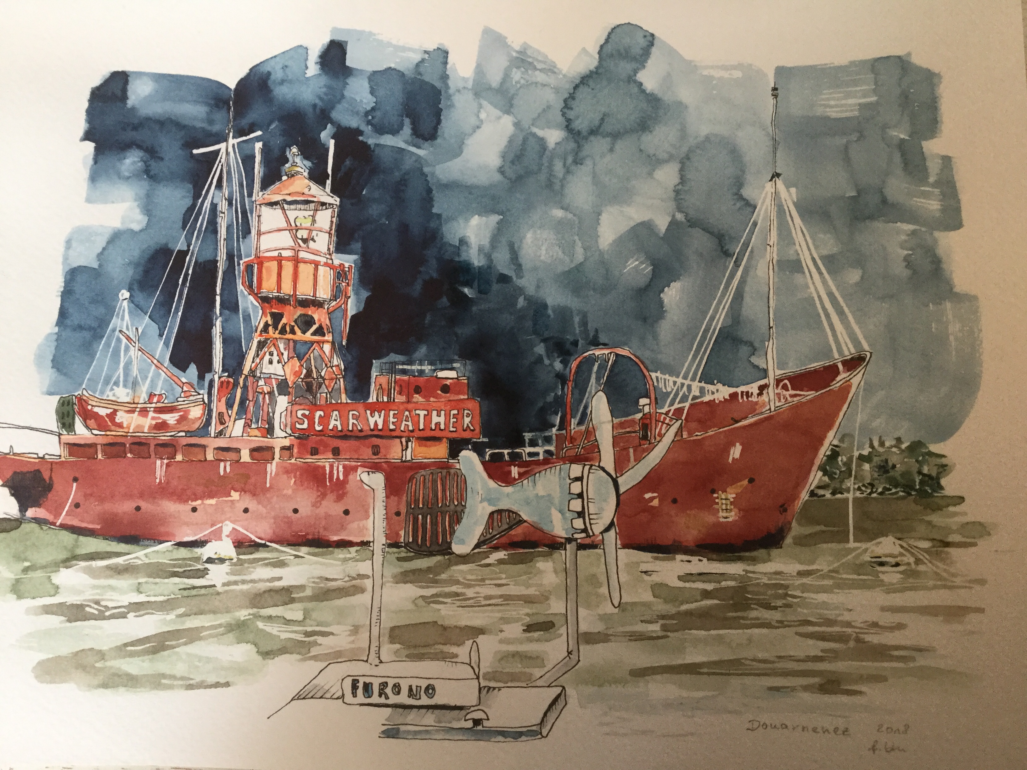 Dieses Feuerschiff sah ich am Hafen in Douarnenez. Ein schwimmender Leuchtturm, der mir beim Überfahren der Brücke inˋs Auge fiel. Mussten wir natürlich gleich am nächsten Tag wieder hin, zum Zeichnen. An dem Tag bibberte ich eine Stunde lang am Wasser, um das komplexe Schiff zu zeichnen. Jetzt, zu Hause, habe ich es in Tinte und Aquarell malerisch interpretiert.