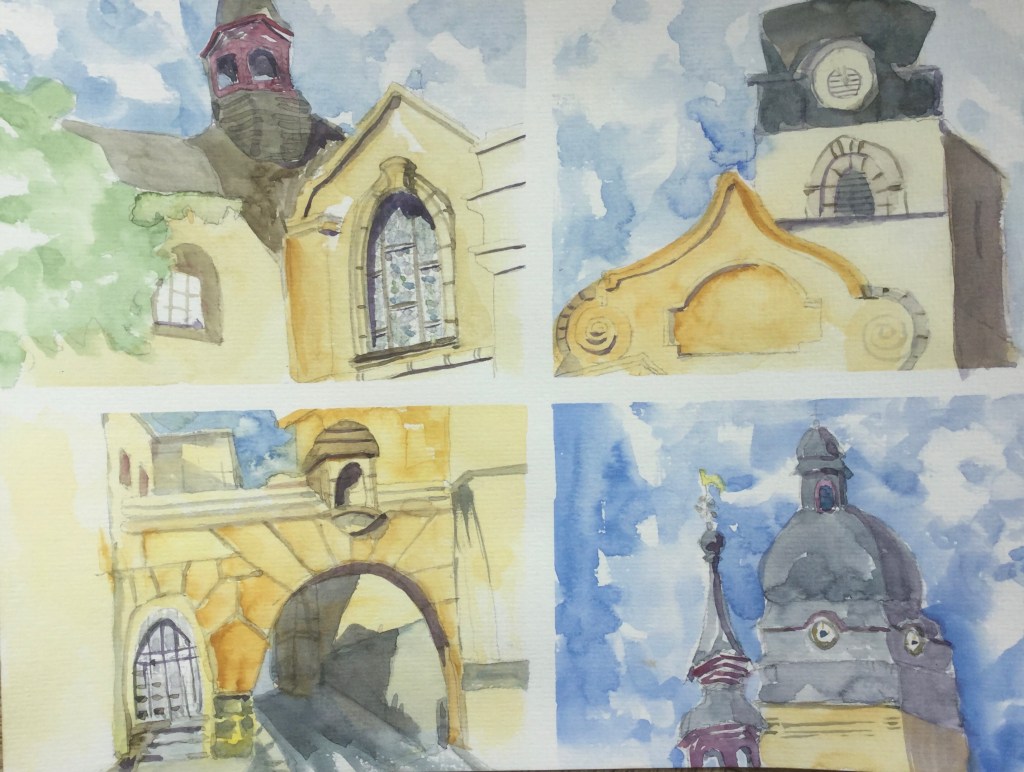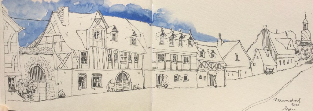 Es gibt ein wunderbares neues Aquarellbuch von Hahnemühle mit getöntem Papier. Das habe ich entdeckt und musste es natürlich kaufen, weil Nathan Fowkes, mit dessen Buch ich mich zur Zeit intensiv auseinandersetze, viele Bilder auf diesem farbigen Papier malt. Mit Fineliner habe ich gezeichnet und mit Ultramarin den Himmel gemalt. Diese Fachwerkhäuser liegen am Rhein in Neuendorf und mein Malbuddy und ich haben bei schönstem Wetter den Charme der ziemlich schief und bucklig gebauten Häuser eingefangen.