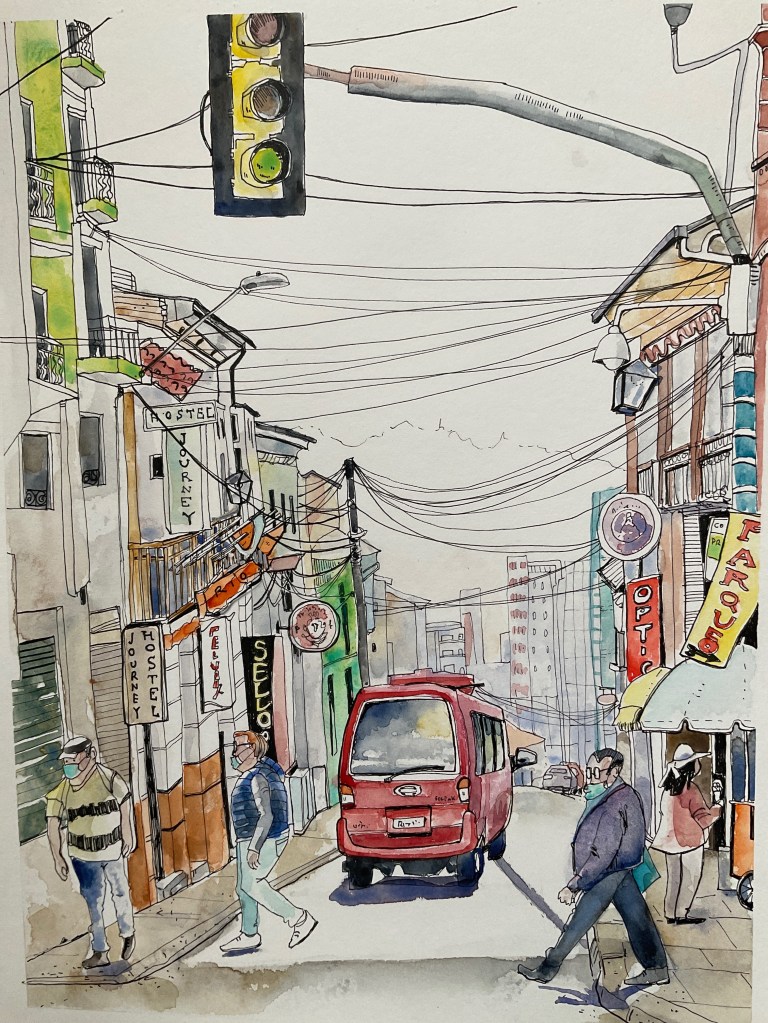 Ich erhielt ein sehr schönes Foto aus La Paz von Tobias Hellwag (@tobiashellwag auf Instagram). Ich hatte solchen Spaß, die Ampel und die Schilder zu zeichnen. Richtig was los auf dem Bild! Ich bin immer glücklich, ein Foto als Referenz zu haben, das ich nicht in Google finde. Tobias Hellwag allowed me to use a beautiful photo of La Paz as reference. I have had so much fun drawing the trafficlight and posters.Thank you very much!