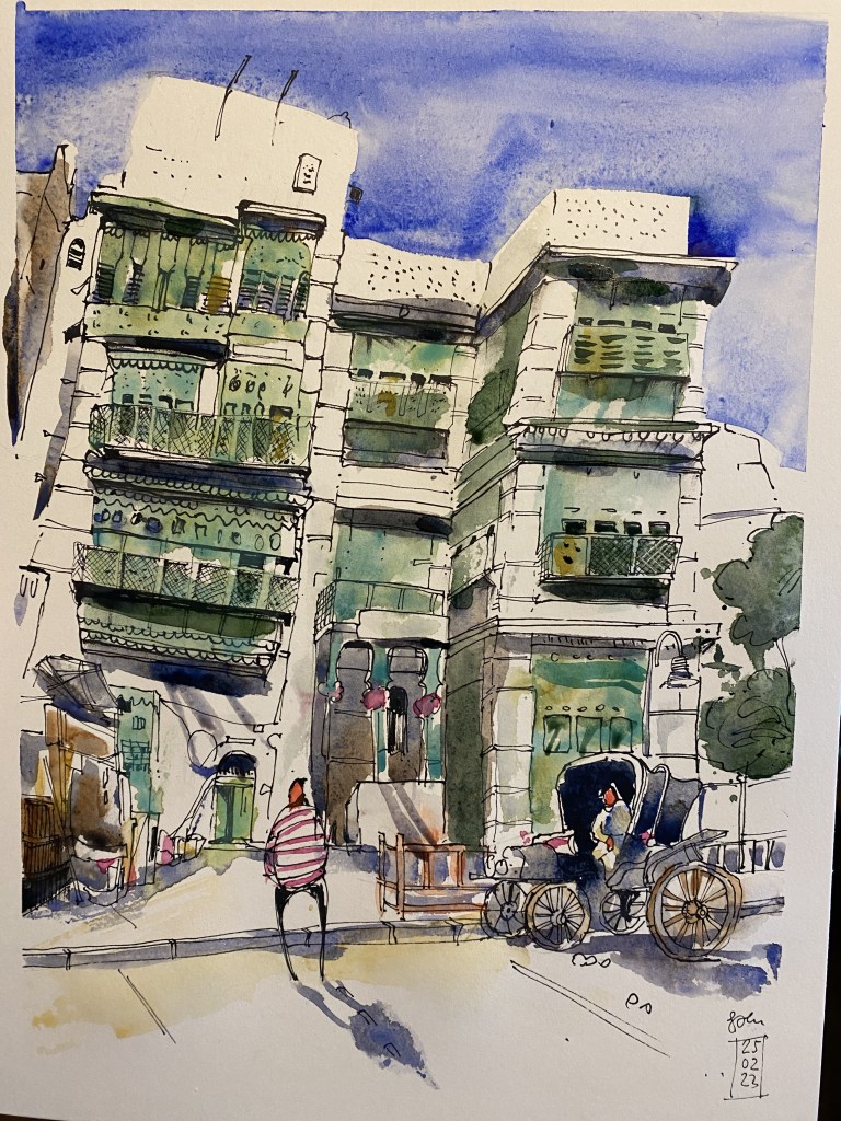 Mit diesem Referenzfoto von Al-Chubar in Saudi-Arabien rief Reham Ali, die wunderbare Urban Sketcherin aus Ägypten, uns auf Instagram zu einer Challenge auf. Ihr wisst, ein Urban Sketch wird immer vor Ort gezeichnet, aber anhand dieses Fotos kann ich Euch den Aufbau gut erklären.