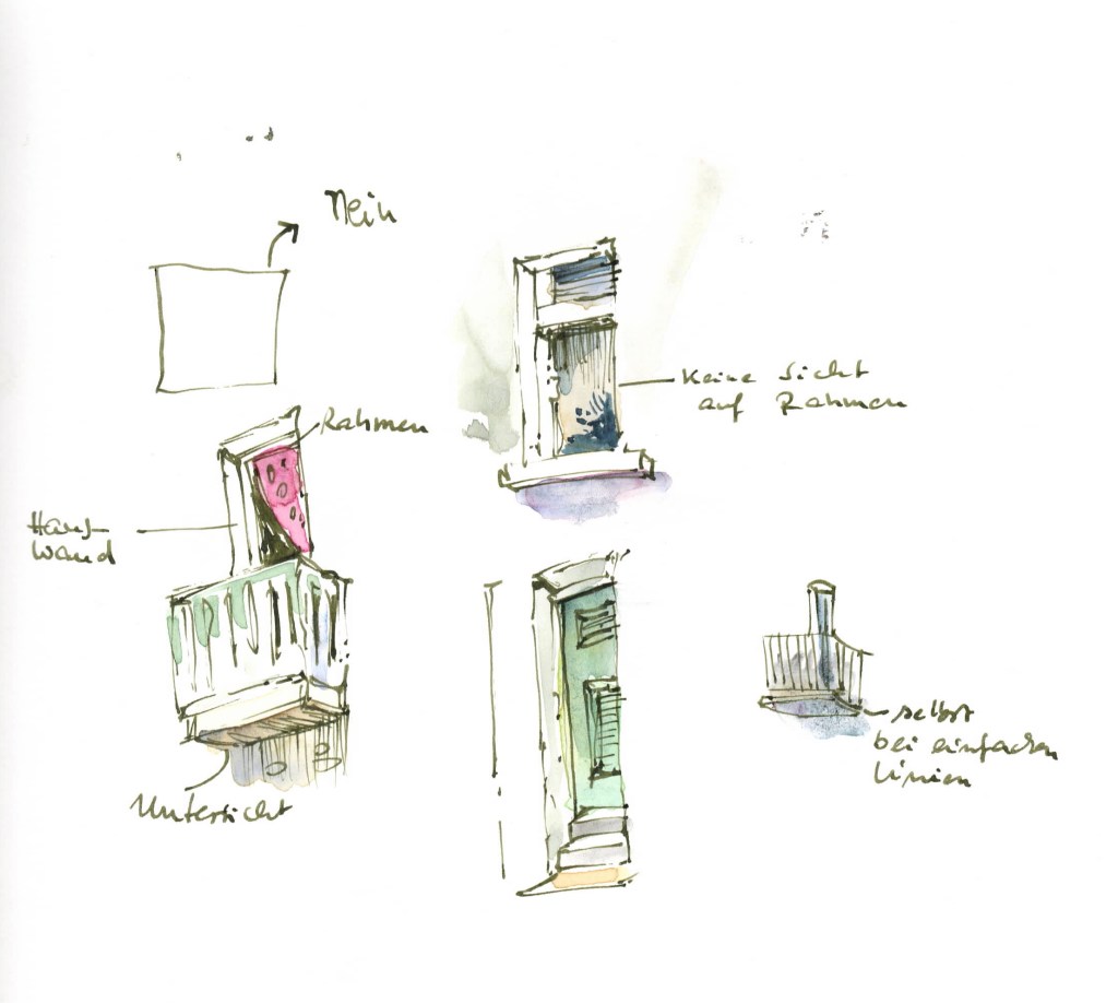 Manchmal sieht man Zeichnungen, in denen Fenster in der Flucht so gezeichnet werden, als würde man von vorne darauf schauen. In Wirklichkeit aber sehen wir nur einen schmalen Spalt. Wenn ich von der Seite schaue, sehe ich nur auf einer Seite Wand und Rahmen. Der Rest ist verdeckt. Auch Türen stehen nie ganz vorne, sie stehen immer ein wenig zurück hinter Mauern, Treppenstufen oder einem kleinen Portal.