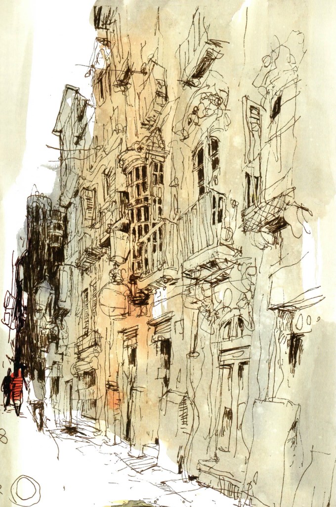 Das muss man sich schon trauen, jetzt noch etwas Eigenes zu posten. 🙂 Dies ist besagte Skizze, die ‚meerestiefeninspiriert‘ entstanden ist. Tiefenwirkung entsteht durch genaue Beobachtung. Wie dick ist die Wand am Fenster, wieviel sehe ich von dem Fensterrahmen, wo habe ich Untersicht?