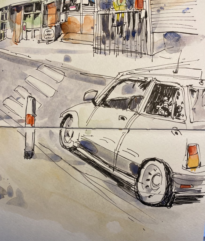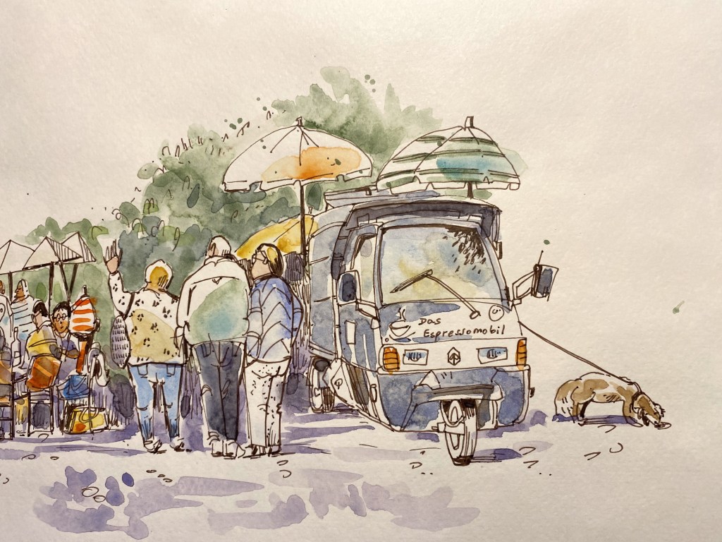 Diesen Sketch habe ich auf unserem Gülser Herbstmarkt gezeichnet. Das kleine TucTuc mit einem feinen Kaffeeangebot hat mir so gefallen. Ich habe ein Cerulean Blau für die gesamte Scheibe genommen und dann von unten etwas lichten Ocker ins Nasse einfließen lassen. Vorher habe ich mit schwarzem Fineliner gespiegelte Blätter gezeichnet. Die Scheibe war gewölbt und verzerrte, deshalb habe ich hier die Variante Nass-in-Nass gewählt.