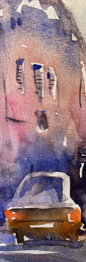 Dies ist ein Ausschnitt aus einem Aquarell, in dem ich die Oberkante des Autos negativ herausgearbeitet habe. Das Licht fällt von hinten links ein und der rechte Teil der Windschutzscheibe liegt im Dunkeln. Der Fahrer ist zum Teil im Schatten. Solche Spiegelungen in Glas sehen raffiniert aus.