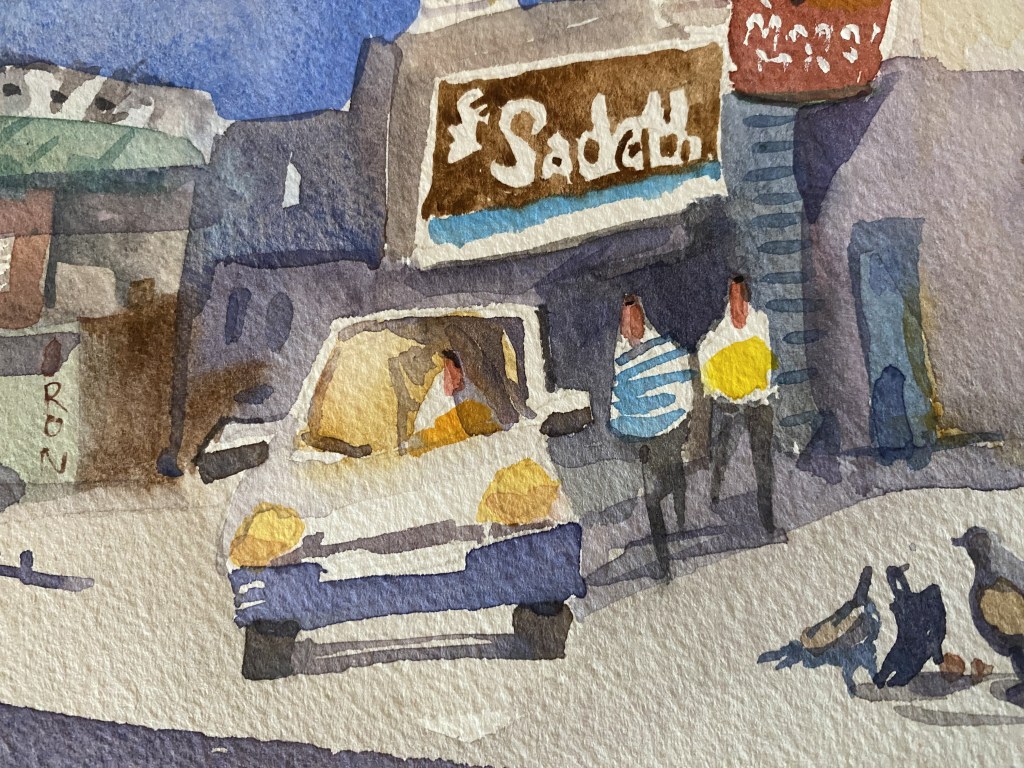 Hier fährt das Auto im Dunkeln durch die Stadt und ich habe das Augenmerk auf die Rücklichter gelegt. Ich habe das Zinnoberrot ins Nasse laufen lassen, damit sie weich nach aussen strahlen. Die Scheibe habe ich dramatisch dunkel gemalt.