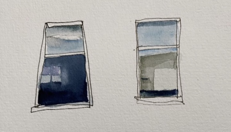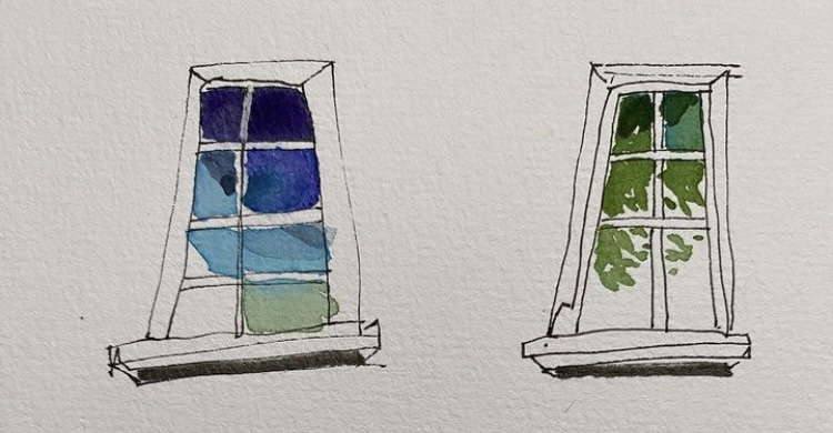 Häufig sehe ich Fenster, die schwarz ausgemalt sind. Dies hat eine dramatische Wirkung, wirkt allerdings sehr hart. Wir verschenken damit die Gelegenheit, die Umgebung des Ortes zu erzählen. Etwas, das für uns Urban Sketcher so wichtig ist, denn wir bezeugen das Hier und Jetzt mit unseren Sketches.