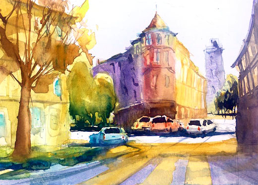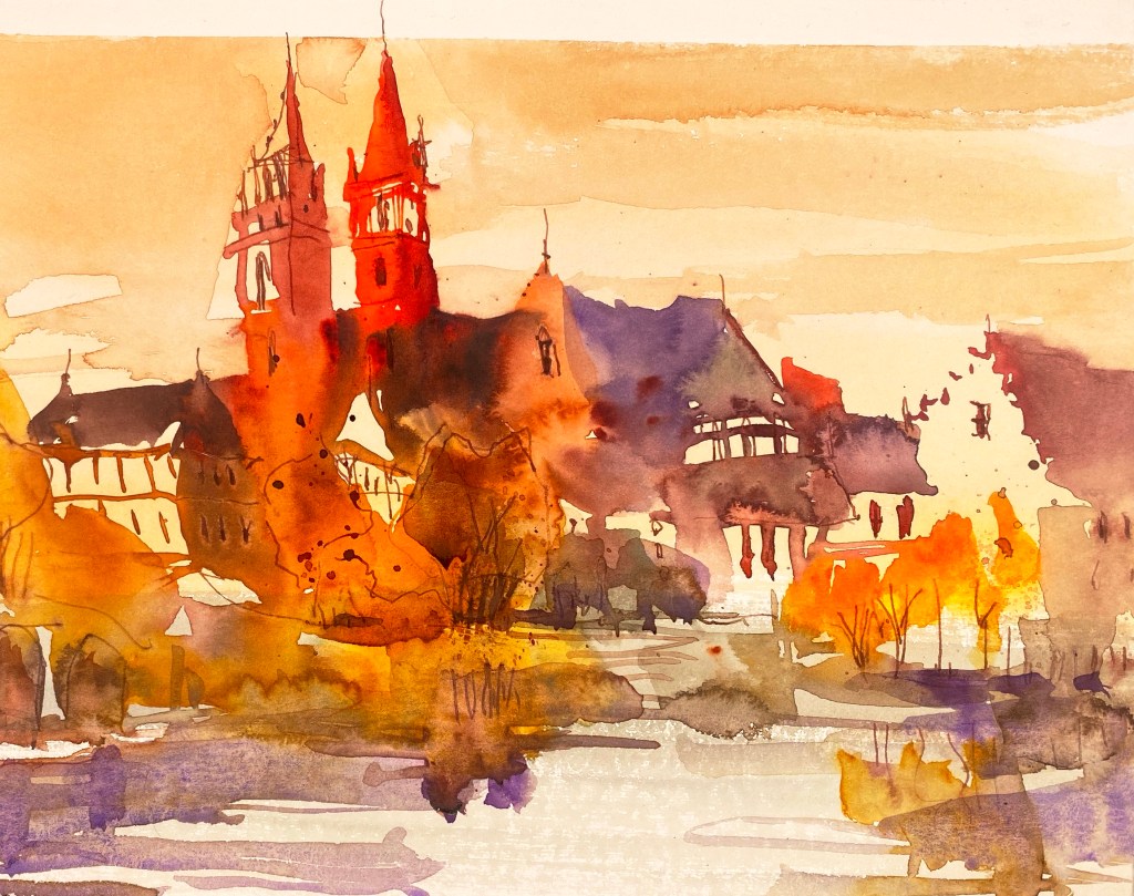Warum passiert das? Stell dir ein warmes Blau vor, zum Beispiel Ultramarin. Dieses Blau hat viel Rot, es ist ja fast Lila. Kommt dazu ein schönes herbstliches Gelb, dann kippen die Farben aufgrund des komplementären Effekts. Leztlich möchte man dies, denn dadurch entsteht der Herbstfarben-Effekt.