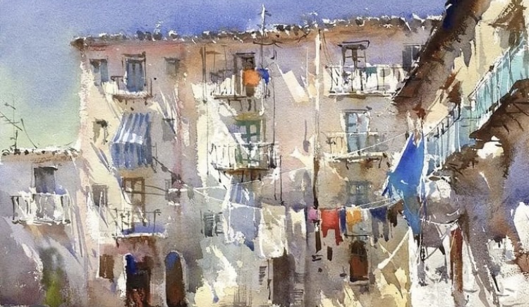 After a light pencil sketch, we start with the brightest spot in the watercolor (houses on the right) with a variation of bright, light colors, such as cadmium yellow, Naples yellow, cadmium orange and opera rose.