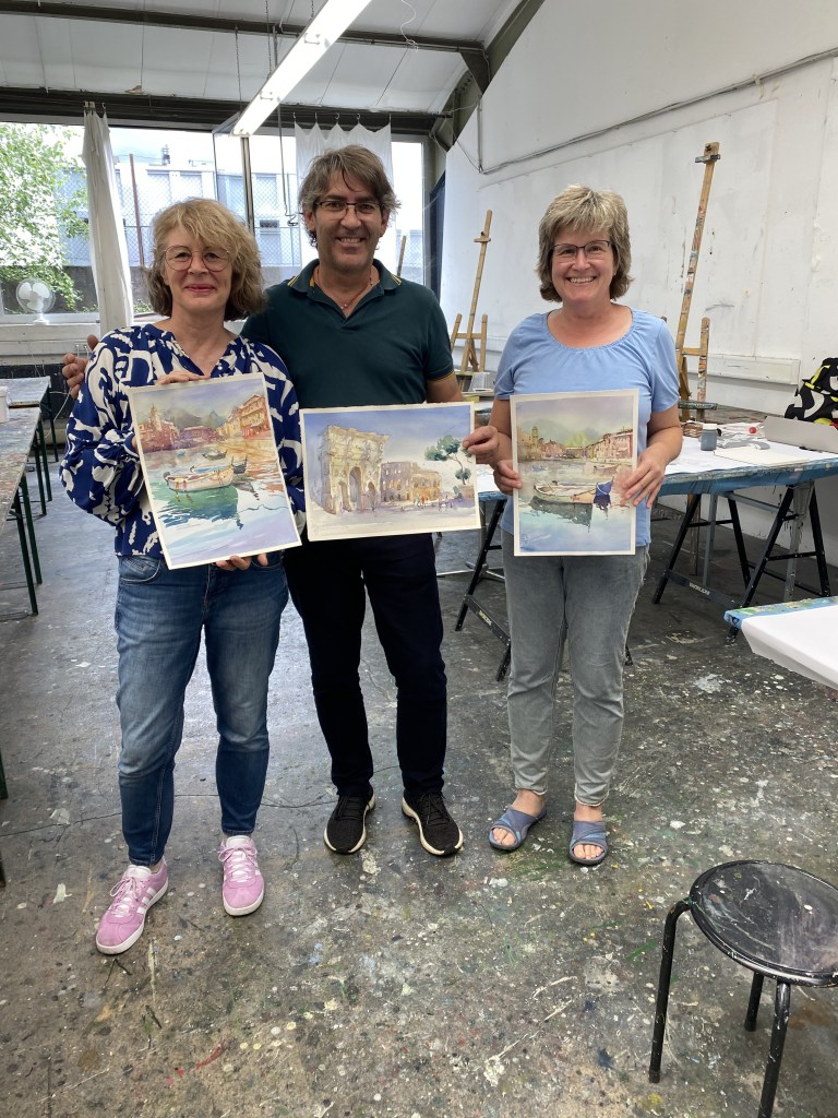 Und, ich kann Euch sagen, ich bin so froh, dass ich von ihm lernen durfte. Keine Anfangsübungen in Kästchen mit „Nass in Nass“- oder Lasurtechniken, sondern gleich ein Sprung in eine Szene mit viel Atmosphäre.