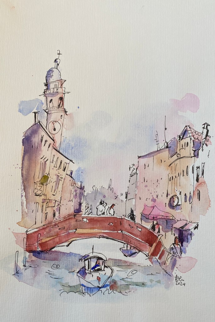Auch in diesem Sketch habe ich mit Übertreibung gearbeitet. Alle Dächer sind ein wenig steiler als in Wirklichkeit, alles ein bisschen windschief und der Turm gebogen, fast wie angetrunken. Es verleiht dem Bild einfach mehr Charakter.