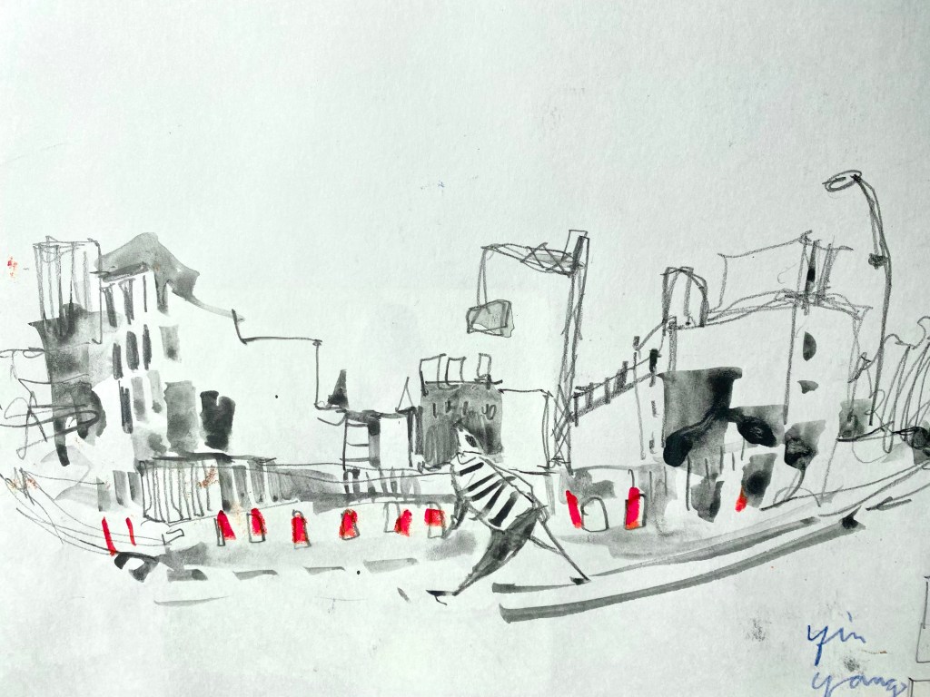 I drew this very quick sketch of a construction site recently in the rain. Quick urban sketching. In this weather, the person wants nothing more than to go home and strides out. The diagonal appears dynamic and is reinforced by the rhythm of the red construction fence panels. Can you see that the picture swings a little due to the curve?